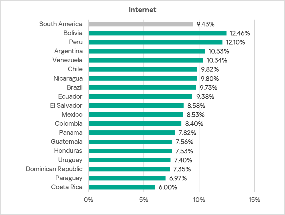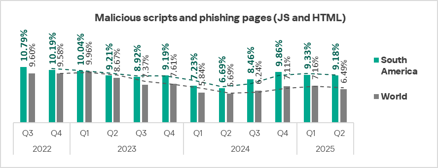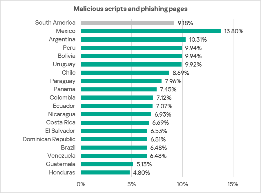 By the percentage of ICS computers on which malicious scripts and phishing pages were blocked, South America ranks first among regions globally, with a rate 1.4 times the global average.