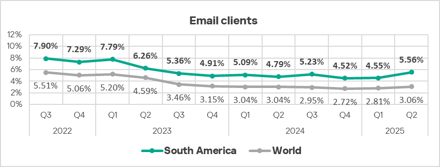 The email client figure has been rising in South America for two consecutive quarters, in line with global trends.