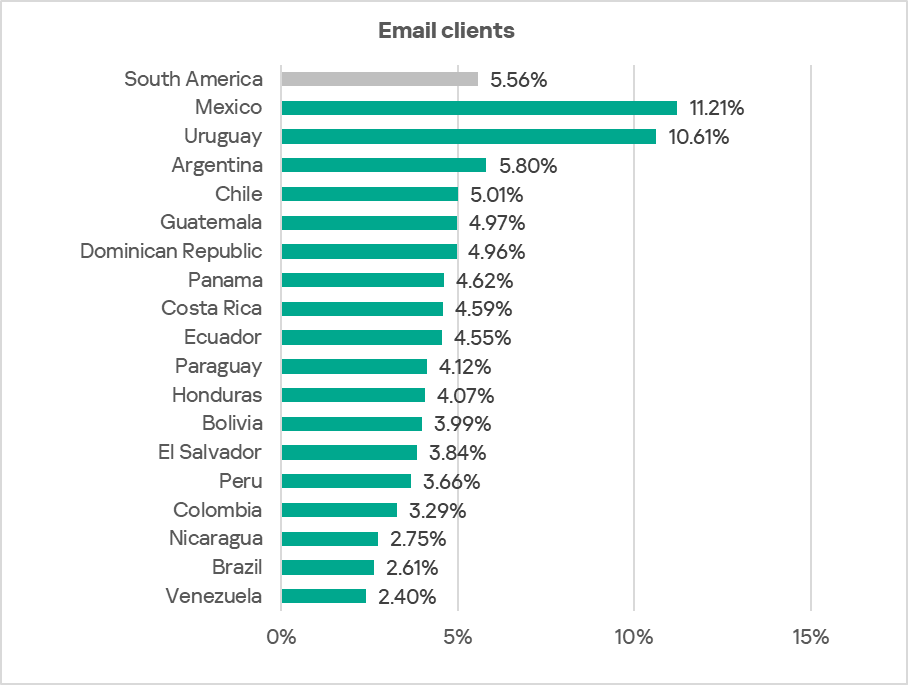 Uruguay and Mexico also top the regional ranking for ICS computers on which email client threats were blocked.