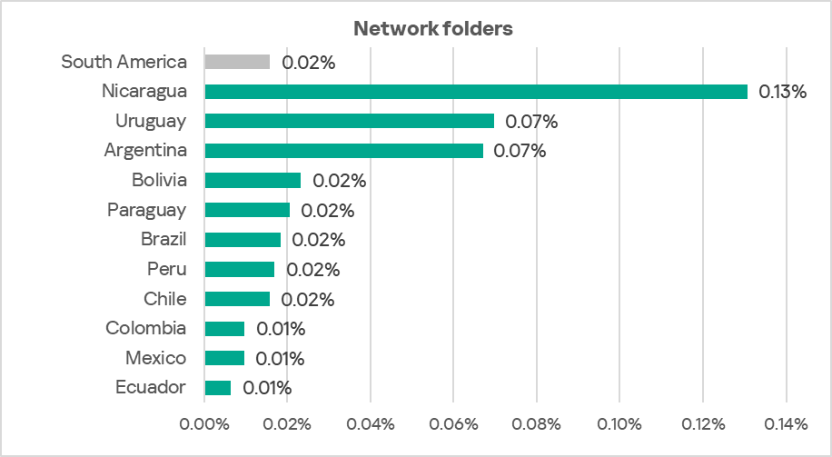 South America ranks ninth among regions by the percentage of ICS computers on which threats from network folders were blocked, with 0.02%. Compared to Northern Europe, which ranks last, the rate is 1.6 times higher.