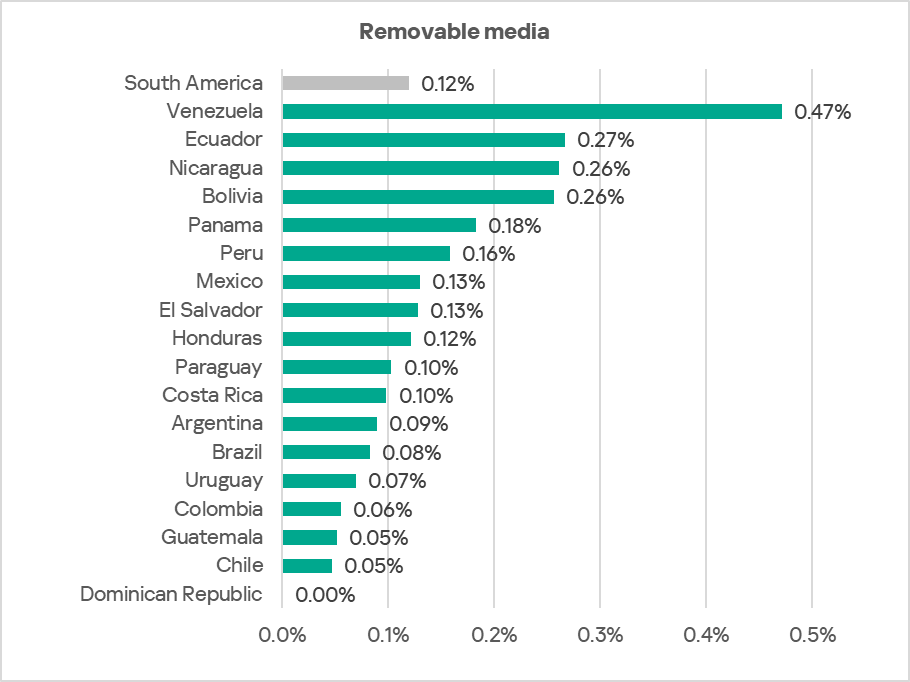 Among countries in the region, Venezuela leads by a wide margin in the percentage of ICS computers on which removable media threats were blocked, with 0.47%.