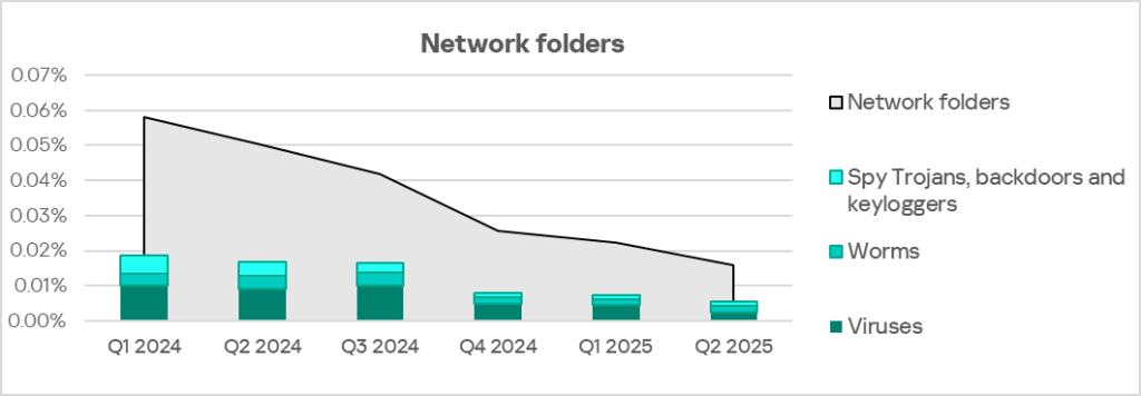 The main categories of threats spreading through network folders in the region are viruses, worms, and spyware.