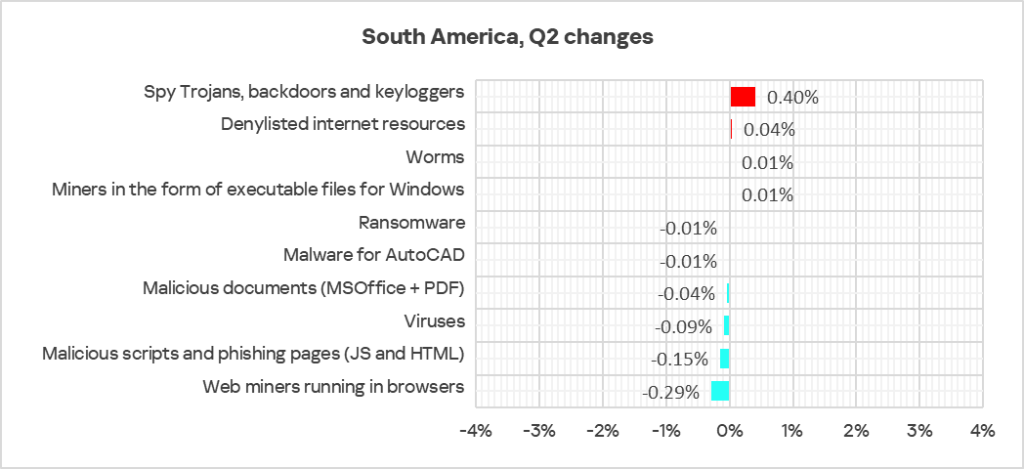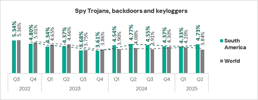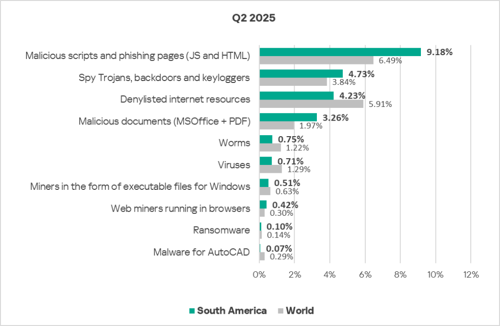 The percentage of ICS computers on which spyware was blocked in South America is 1.2 times higher than the global average. In the regional ranking of threat categories, spyware occupies second place. South America also leads globally in the growth rate of this category in Q2 2025.