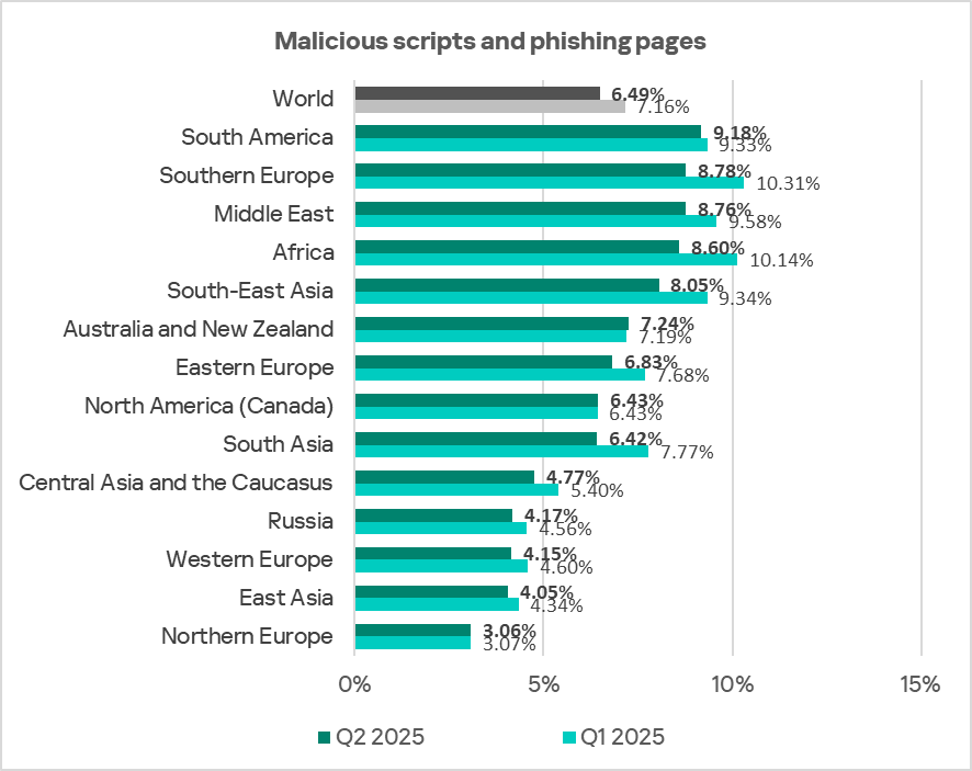 In Q2 2025, the percentage of ICS computers on which malicious scripts and phishing pages were blocked decreased in all but two regions: North America (Canada), and Australia and New Zealand.