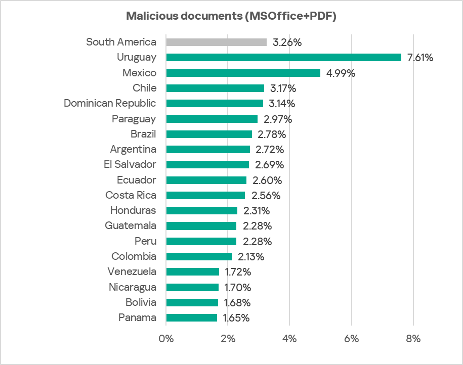 In terms of ICS computers on which malicious documents were blocked, South America ranks second globally, with a rate 1.7 times the global average.