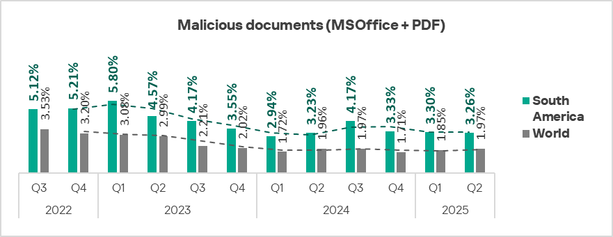 The percentage of ICS computers on which malicious documents were blocked in South America has been declining for three consecutive quarters. In Q2 2025, the region’s figure was 3.26%, which is 5.1 times higher than in Northern Europe, the lowest-ranked region.
