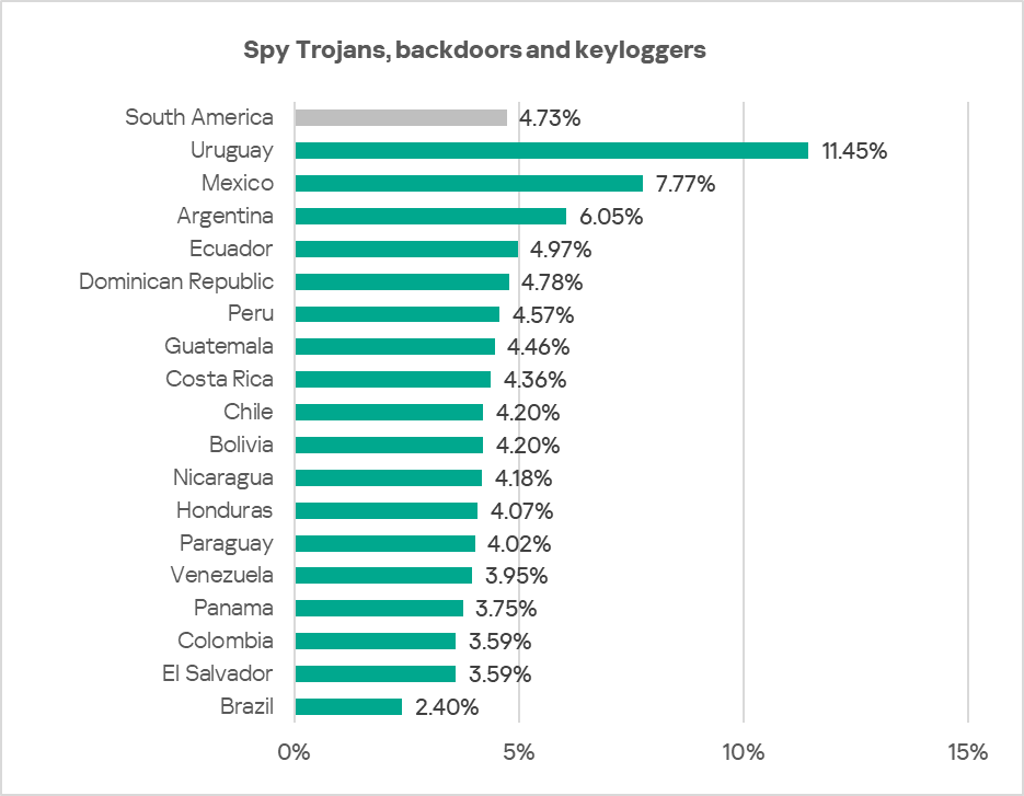 The top three countries for email client threats — Mexico, Uruguay, and Argentina — also rank high in spyware. Mexico and Argentina also lead in malicious scripts and phishing pages, while Uruguay and Mexico lead in malicious documents.
