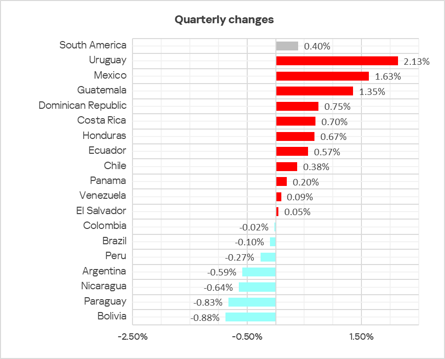 In Q2 2025, the percentage of ICS computers on which spyware was blocked grew in only two regions, with South America leading in growth. Within the region, the largest increases were recorded in Uruguay, Mexico, and Guatemala.