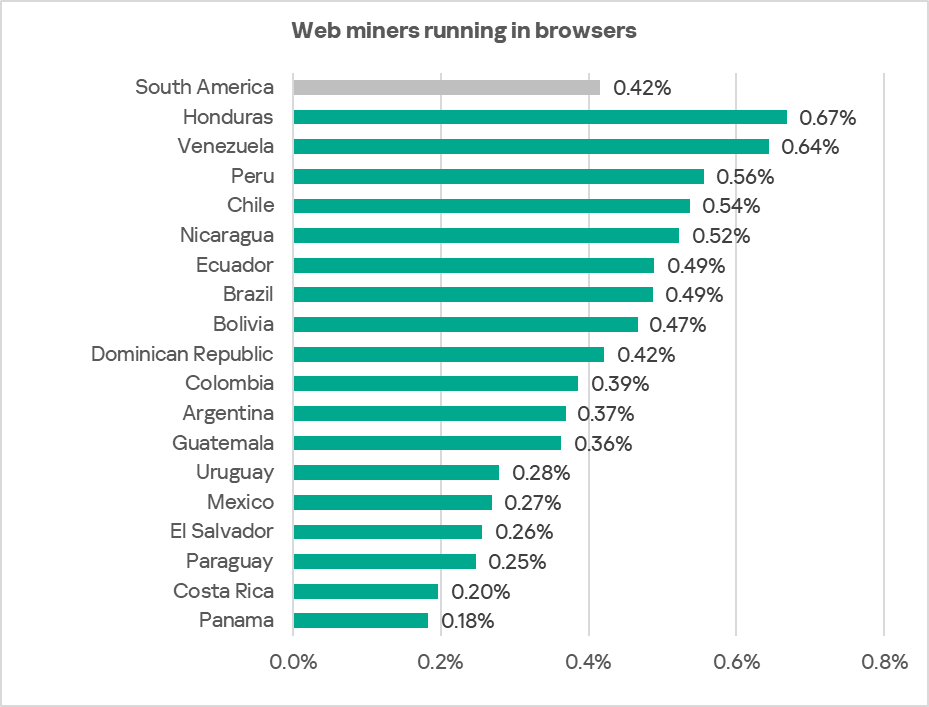 In terms of ICS computers on which web miners were blocked, South America ranks second globally with 0.42%. This is four times higher than in East Asia, which has the lowest figure.