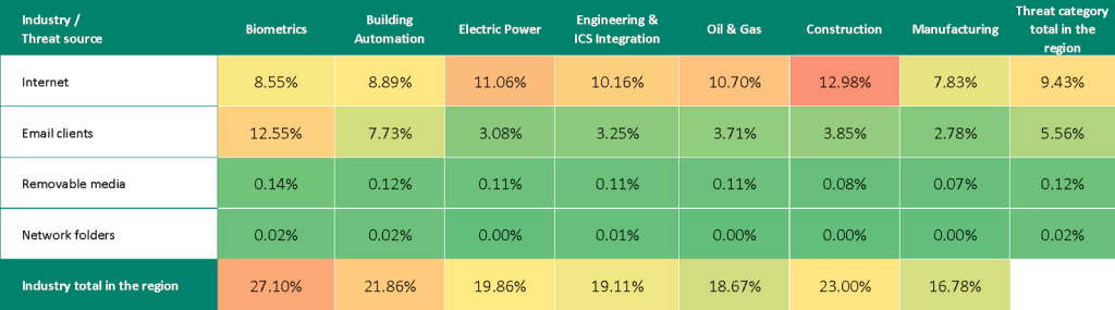 Relatively high percentage figures for threats distributed via email clients (phishing), malicious scripts, and both categories of miners may indicate that OT systems in the region are accessible to the more advanced categories of threat actors.