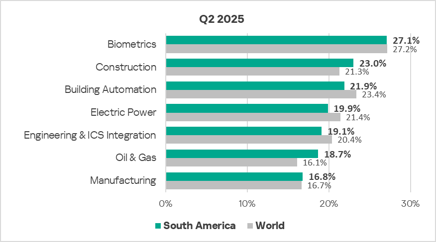 In terms of ICS computers on which threats from removable media were blocked, South America ranked ninth among regions in Q2 2025. In North America (Canada), which ranks last, the rate is 4.5 times lower.