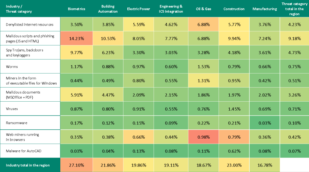 We use heat maps to assess threats facing industries. On these maps, cells are colored from red to green, where red indicates the maximum value for an industry in the region, or a threat source or type across all regions and industries. In South America, near-maximum values are observed for internet threats in construction, web miners in oil and gas, as well as malicious scripts and phishing pages in biometric systems.