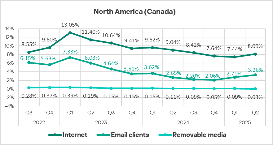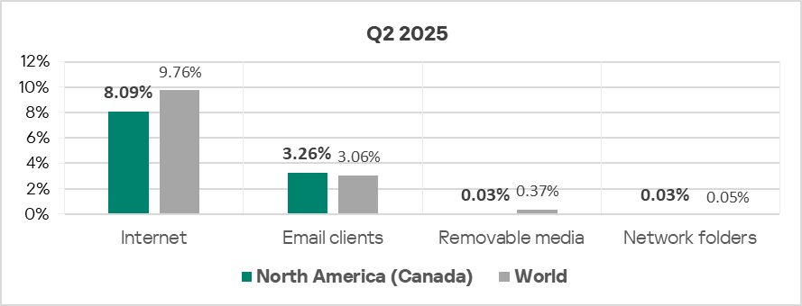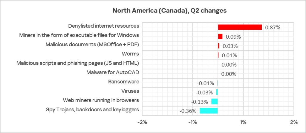 North America (Canada) is one of the five regions where the percentage of internet threats increased in Q2 (second place in the ranking), as well as one of the three regions where there was a slight increase in the percentage of threats in network folders, against the backdrop of an overall decline.