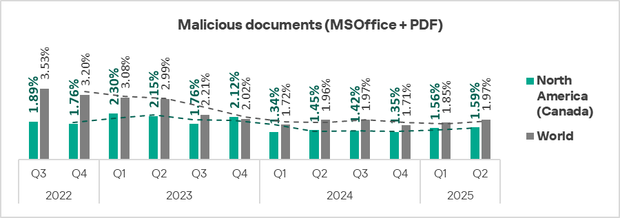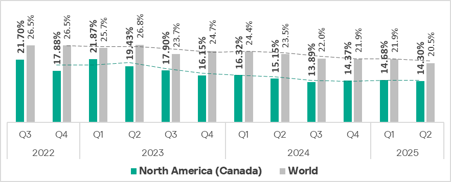 In Q2 2025, North America (Canada) also ranked second among the four regions that saw an increase in the percentage of computers on which miners in the form of executable files were blocked, while in most regions, the percentage figures for this threat category decreased.