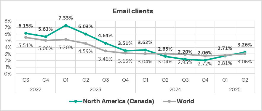 North America (Canada) ranked 8th in Q2 2025, with 3.30%, based on the percentage of ICS computers on which threats from email clients were blocked. This is 4.1 times higher than in Russia, which ranks last in this category.