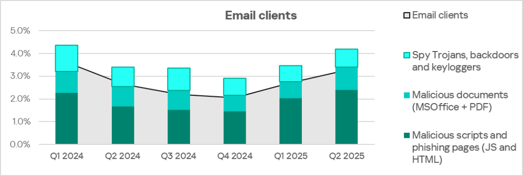 In Q2 2025, the percentage of ICS computers on which threats from email clients were blocked increased in all regions except Russia. South America also has the highest growth rate for this threat source.