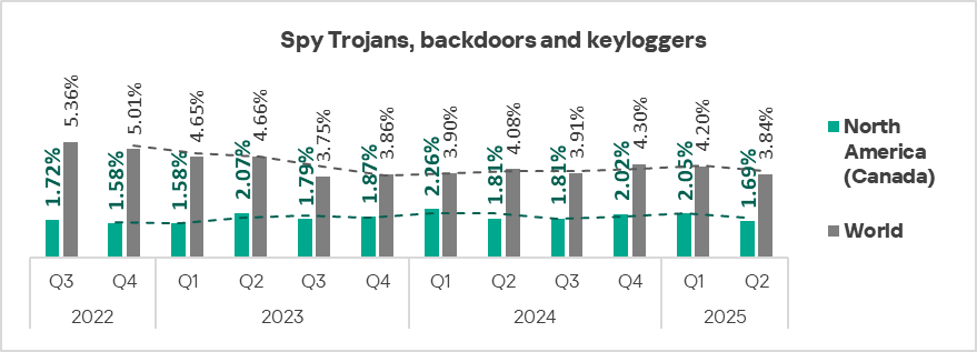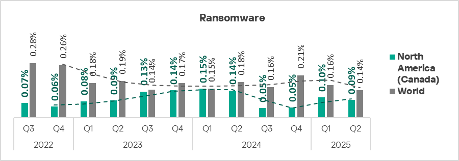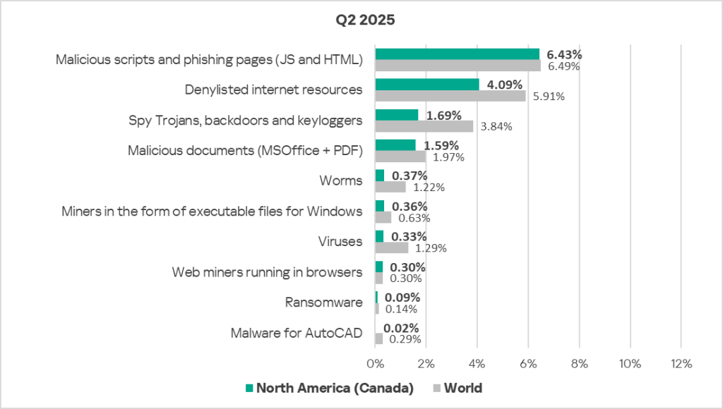 In North America (Canada), all threat category percentage values are below the respective global averages.