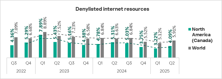 North America (Canada) ranks third to last among regions, with 4.09%, based on the percentage of ICS computers on which denylisted internet resources were blocked. However, the region ranks seventh in terms of the increase in this parameter — the percentage increased by a factor of 1.3 during the quarter.