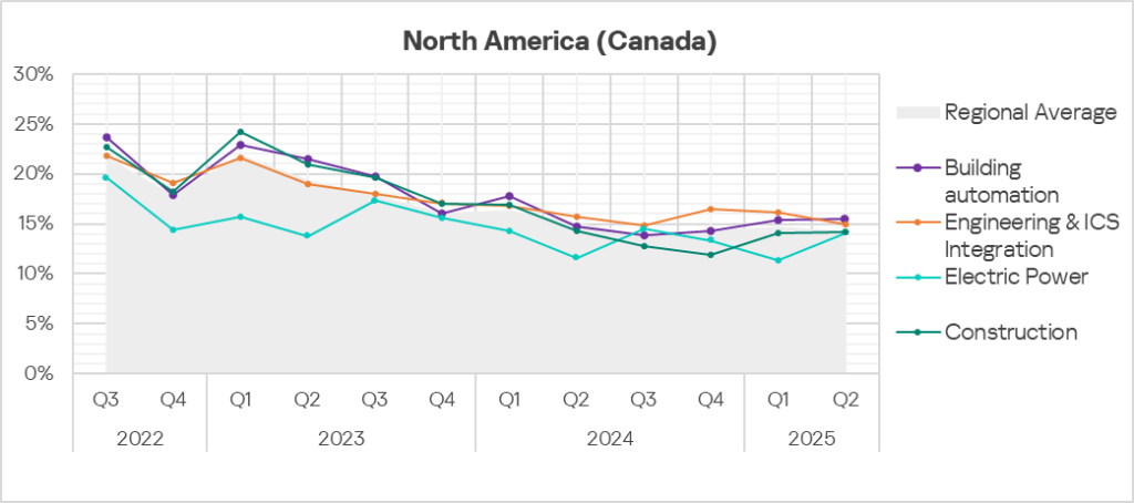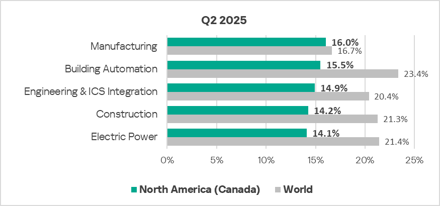 The cybersecurity situation in North America (Canada) is among the most favorable across all regions. The region ranked 12th in Q2 2025 based on the percentage of ICS computers on which malicious objects were blocked.