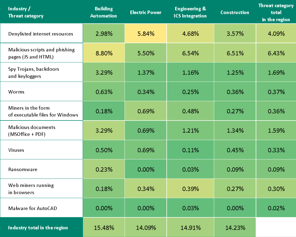 - Ranks third among industries in the region based on the percentage values for the following threat categories: denylisted internet resources, malicious scripts and phishing pages, spyware, viruses, and miners of both types.
