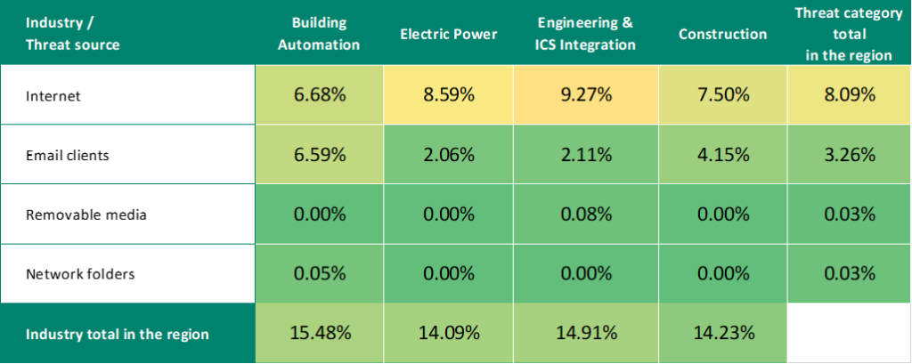 - Ranks first among industries in the region based on the percentage of ICS computers on which threats were blocked in email clients and in network folders.