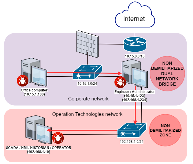 The diagram below shows a scenario in which WannaCry malware penetrates from the corporate network to the industrial network via the workstation of the industrial automation system’s engineer/administrator, which is connected both to the corporate network and the industrial (Operation Technologies) network using two network adaptors.