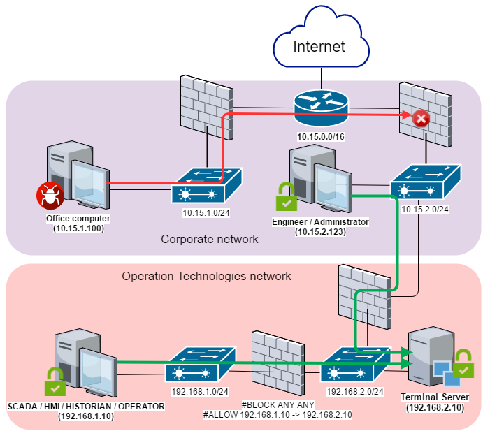 As mentioned above, as a rule either the industrial network is not directly connected to the Internet or access is provided via the corporate network using NAT, a firewall and a corporate proxy server, which should make it impossible to infect such systems via the Internet.