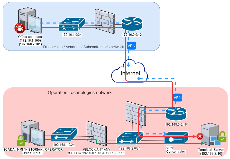 The diagram below presents the scenario of WannaCry malware penetrating the industrial network from a remote network (dispatch center or contractor) via a VPN channel.