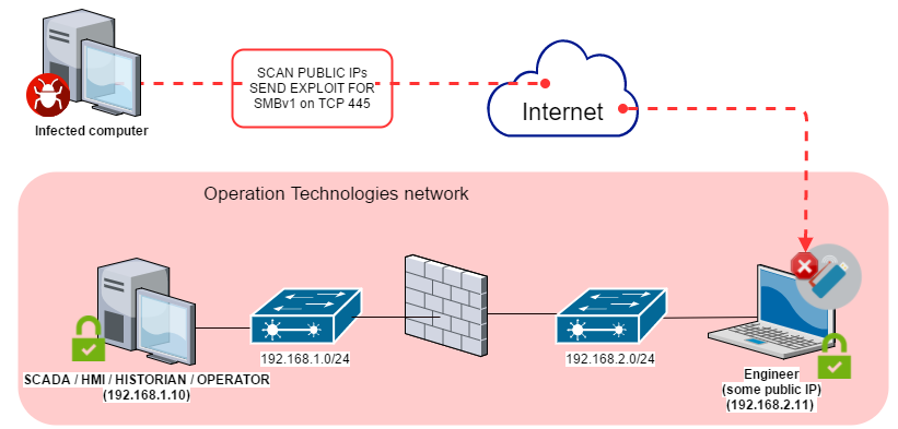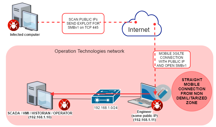 The diagram below provides an example of an attack against computers on the industrial network by WannaCry malware using an Internet connection that bypasses the network perimeter.