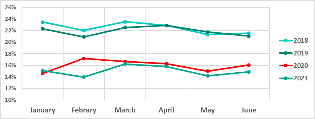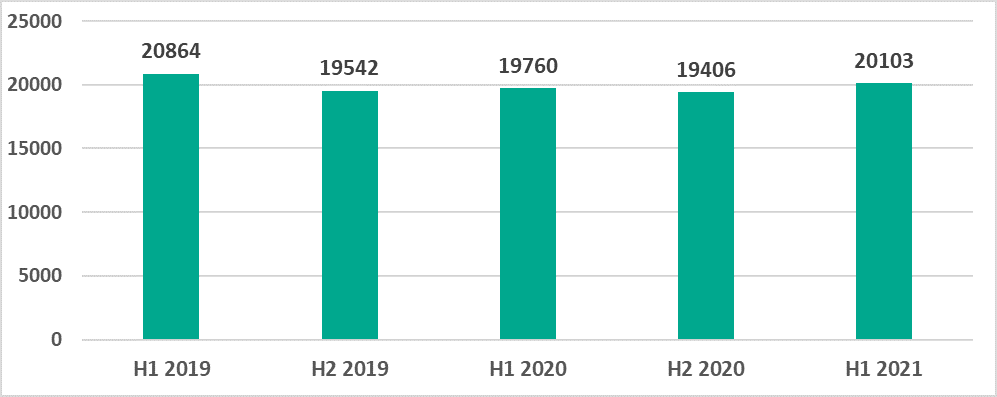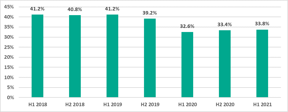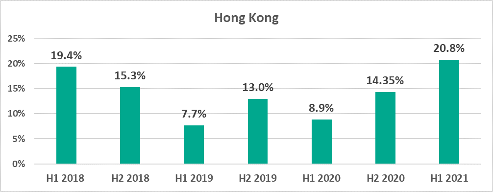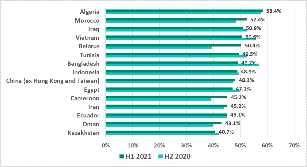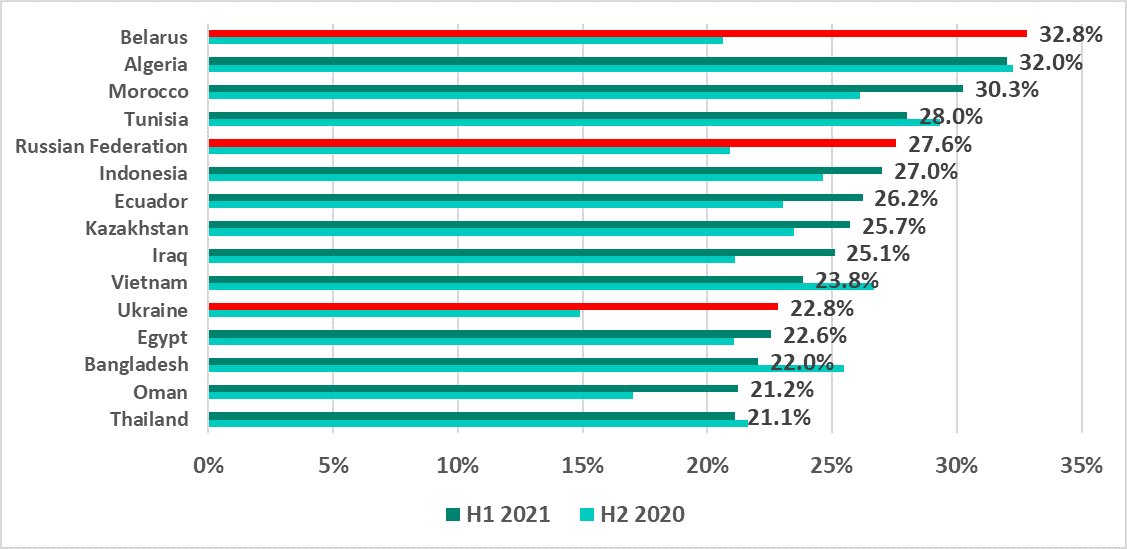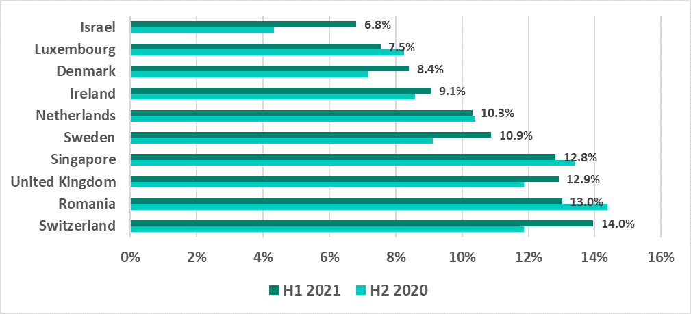 The largest increases in this percentage in H1 2021 were recorded as follows: