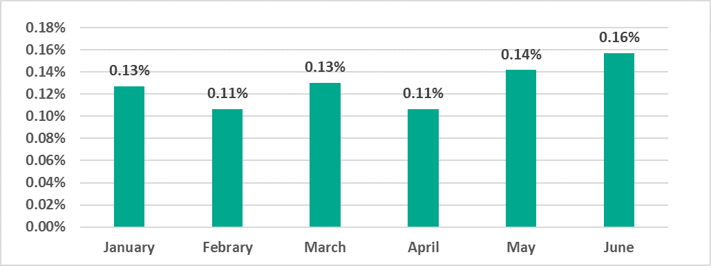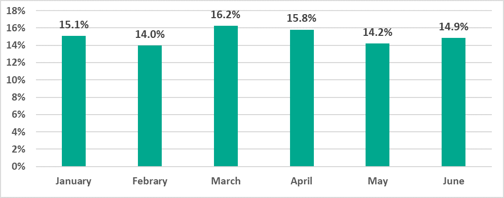 The largest percentage of ICS computers on which ransomware was blocked occurred in June (0.16%) and the smallest in February and April (0.11%).