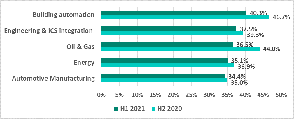 In H1 2021 the indicators in all selected industries decreased, particularly noticeably in oil and gas (-7.5 p.p.) and building automation (-6.4 p.p.).