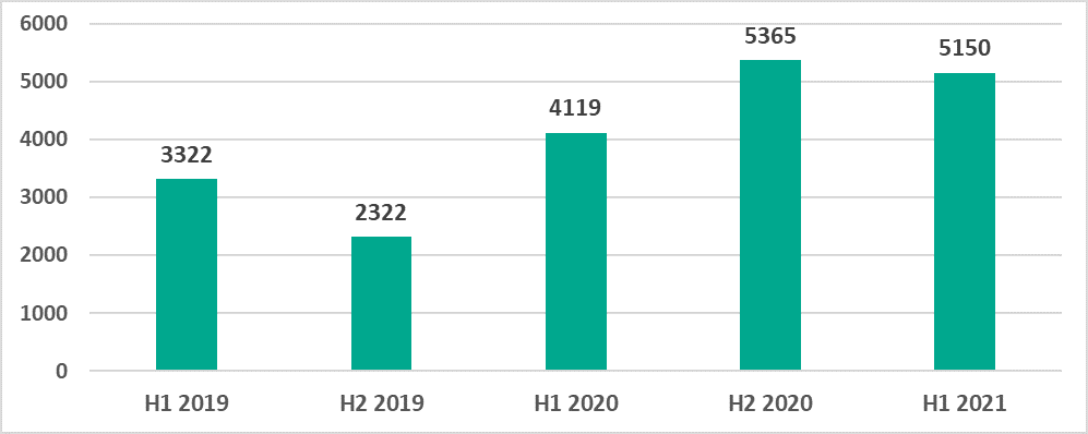 The number of malware families has slightly decreased in H1 2021 versus H2 2020 but remains higher than the numbers recorded in the previous eighteen months.