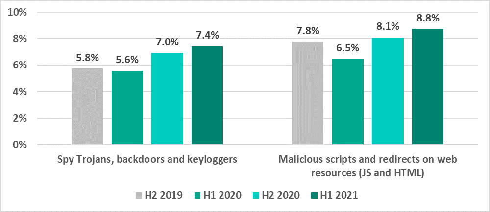 - Spyware – Trojan-Spy malware, backdoors and keyloggers – up by 0.4 p.p.