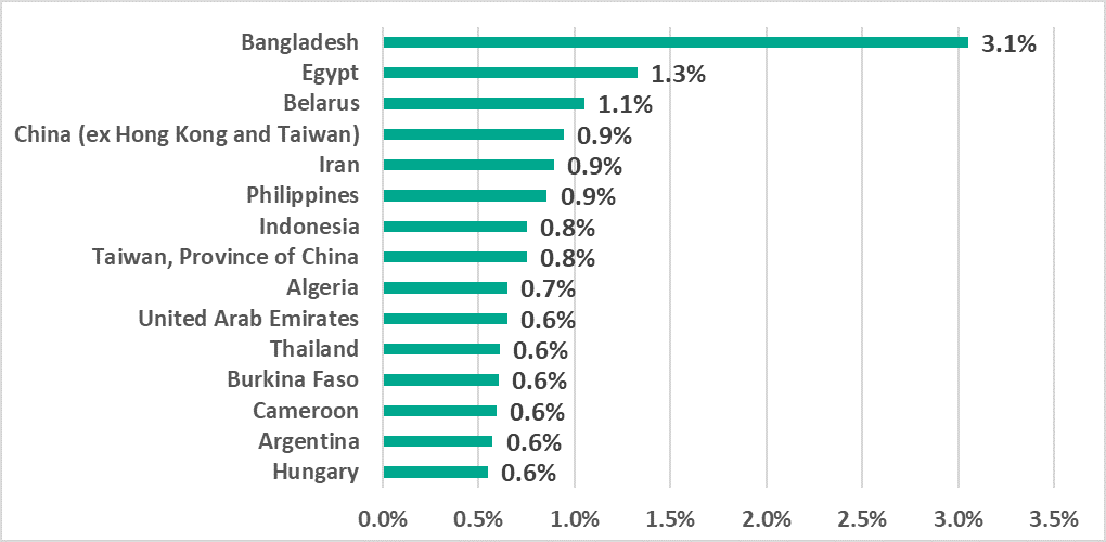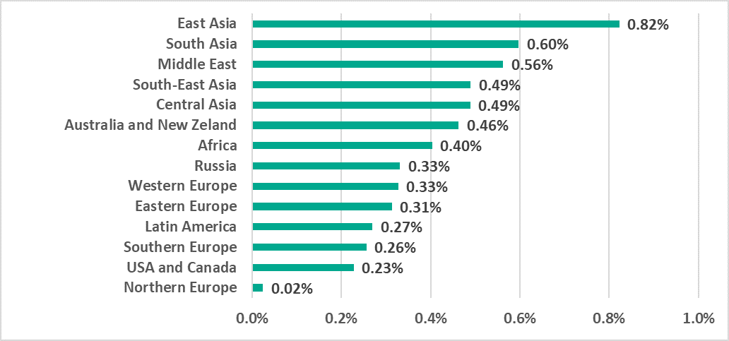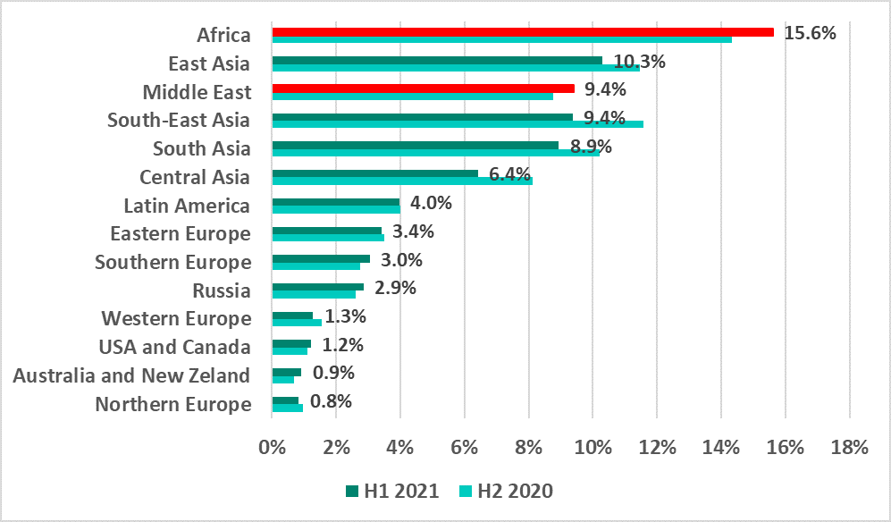 In all Asian regions the percentages decreased by 1.2 – 2.2 p.p., whereas in the Middle East the percentage increased slightly (by 0.6 p.p.). As a result, the Middle East has gone up from fifth to third place in the ranking.