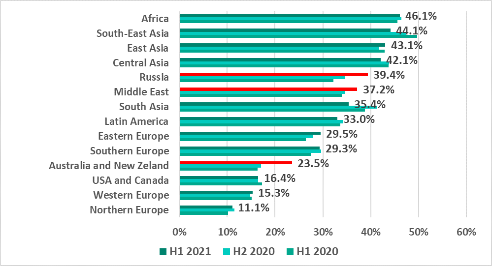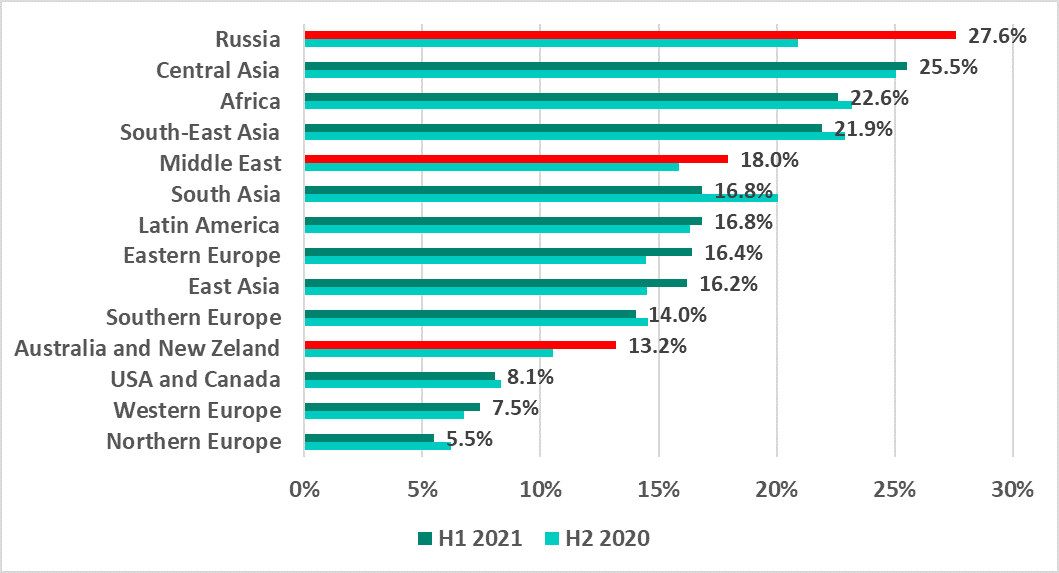 - By 6.7 p.p. in Russia, which unexpectedly took first place among all regions with 27.6%;