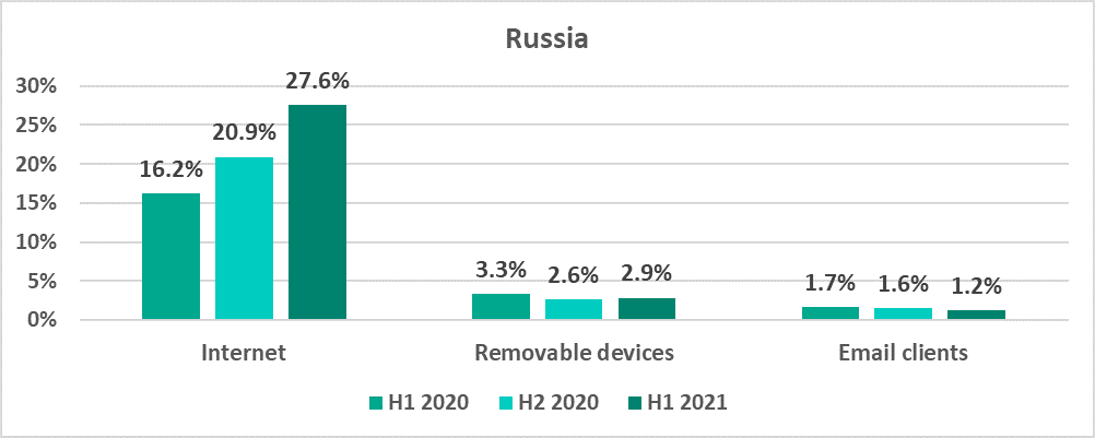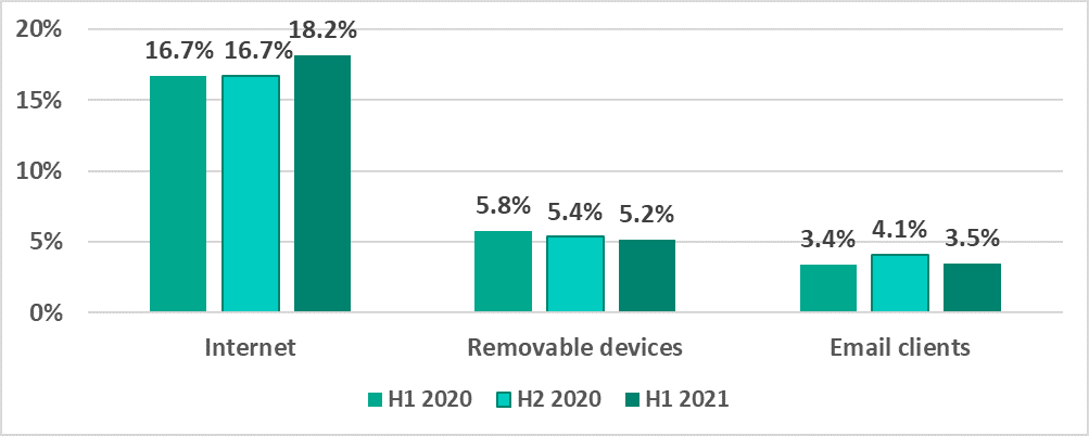 - Threats blocked when removable media was connected have been decreasing throughout the past year; in H1 2021 their percentage decreased by 0.2 p.p.;