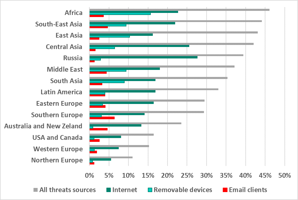 As in previous periods, in the safer regions – Europe, USA and Canada, and Australia and New Zealand – the percentage figures for malicious email attachments are higher than those for removable media.