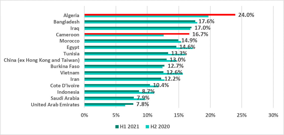 The largest increases of these percentages were recorded in Algeria and Cameroon – by 4.3 and 4.1 p.p. respectively.