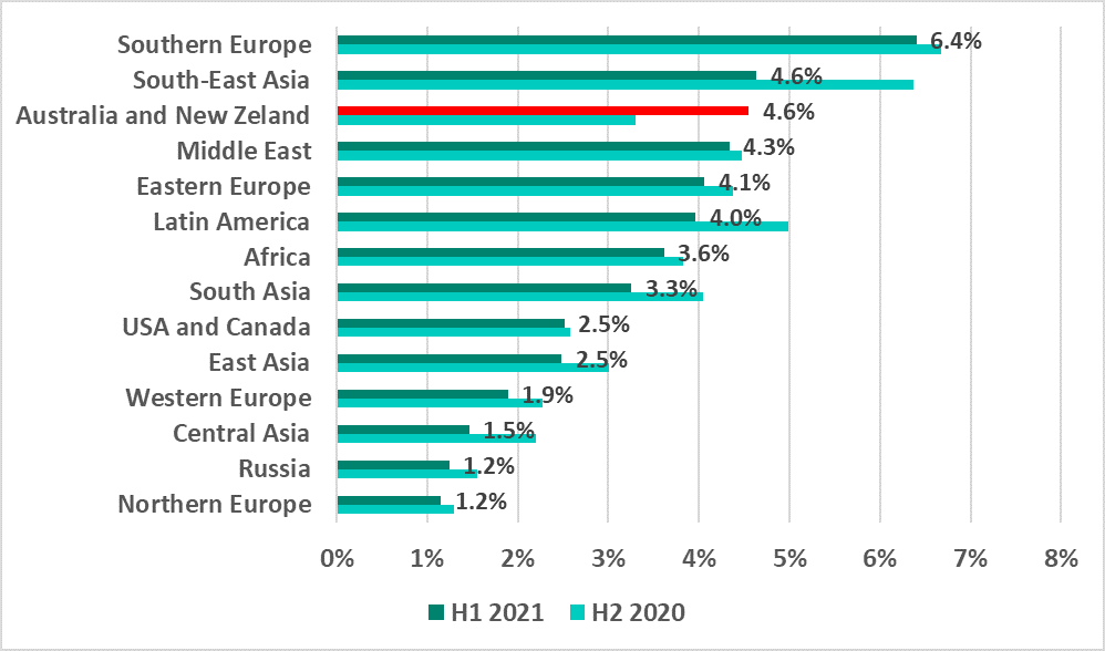 - By 2.7 p.p. in Australia and New Zealand, placing this region into the second group with 13.2%;