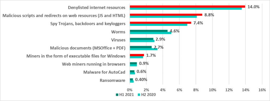 - Internet threats – denylisted web resources involved in the distribution or management of malware – up by 0.5 p.p.;
